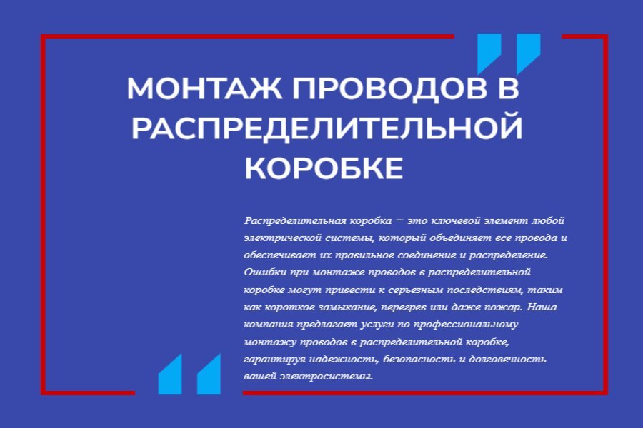 Распределительная коробка – это ключевой элемент любой электрической системы, который объединяет все провода и обеспечивает их правильное соединение и распределение. Ошибки при монтаже проводов в распределительной коробке могут привести к серьезным последствиям, таким как короткое замыкание, перегрев или даже пожар. Наша компания предлагает услуги по профессиональному монтажу проводов в распределительной коробке, гарантируя надежность, безопасность и долговечность вашей электросистемы.
